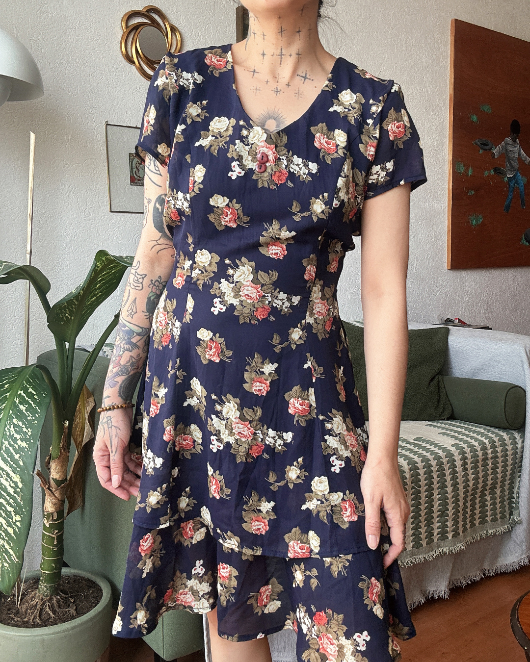 Vestido corto en azul marino con un estampado floral clásico en tonos crema y rosa. Escote en «V» con detalle de botones forrados y falda de corte evasé con una capa doble que aporta movimiento.